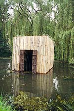 Knippenberghs Schaffen erstreckt sich auch auf den öffentlichen Raum. Sein großer schwimmender Holzwürfel (3,18 m Kantenlänge), 1972 in einem Eindhovener Parkgelände erbaut, erscheint mir als ein besonders überzeugendes Beispiel für die beinahe lyrische Wirkung seiner Skulpturen. Die leichte Schräglage des „Kubus“, die ein Versinken suggeriert, die farbliche Vielfalt der verwandten Holzplanken, dazu die wuchernden Pflanzen auf der erdbeschichteten Oberseite und die zielsichere Plazierung unter einer großen Trauerweide: das alles vereint sich zu einer äußerst sensiblen Komposition, die den Ort in eine melancholische Poesie hüllt.